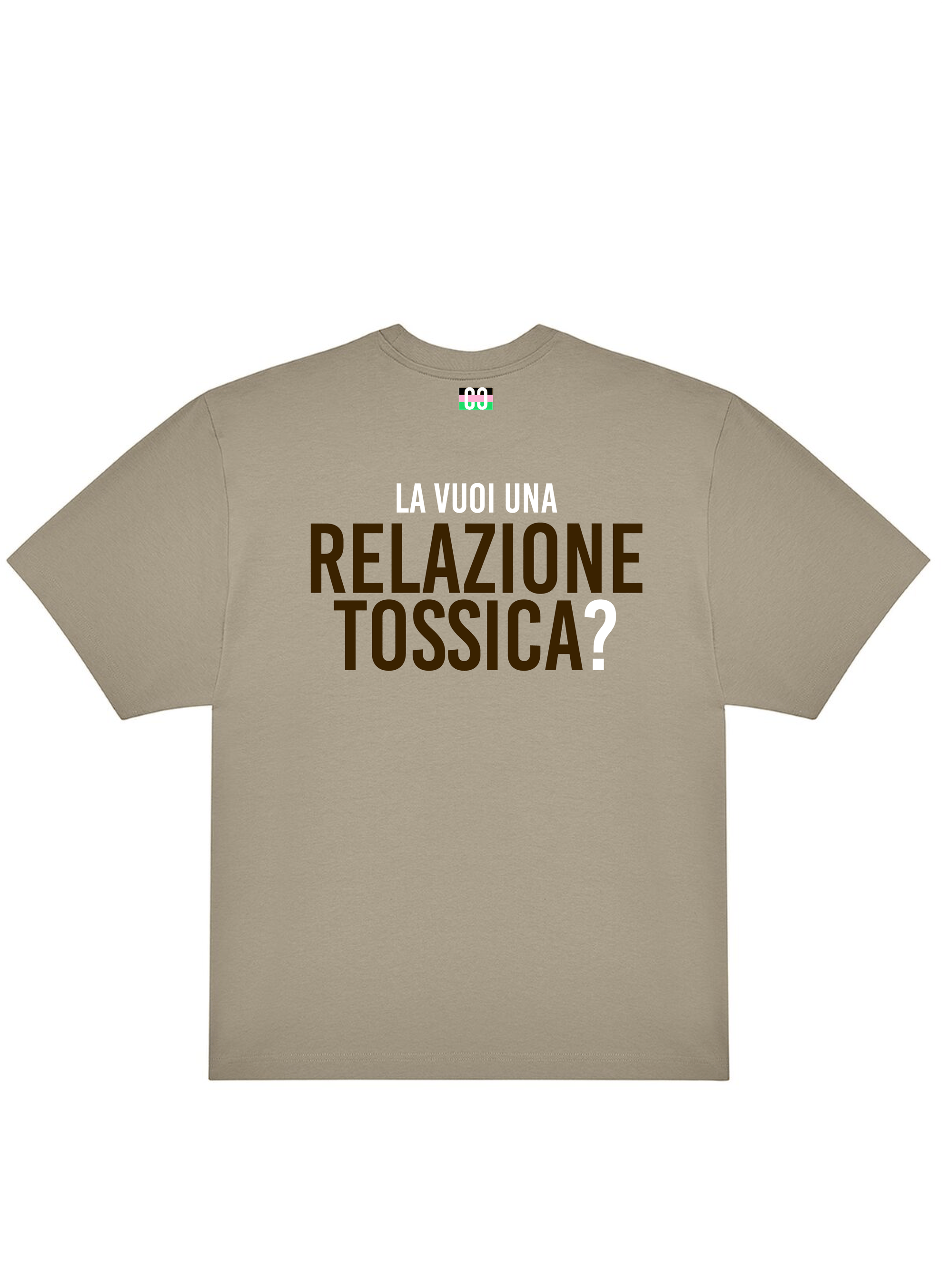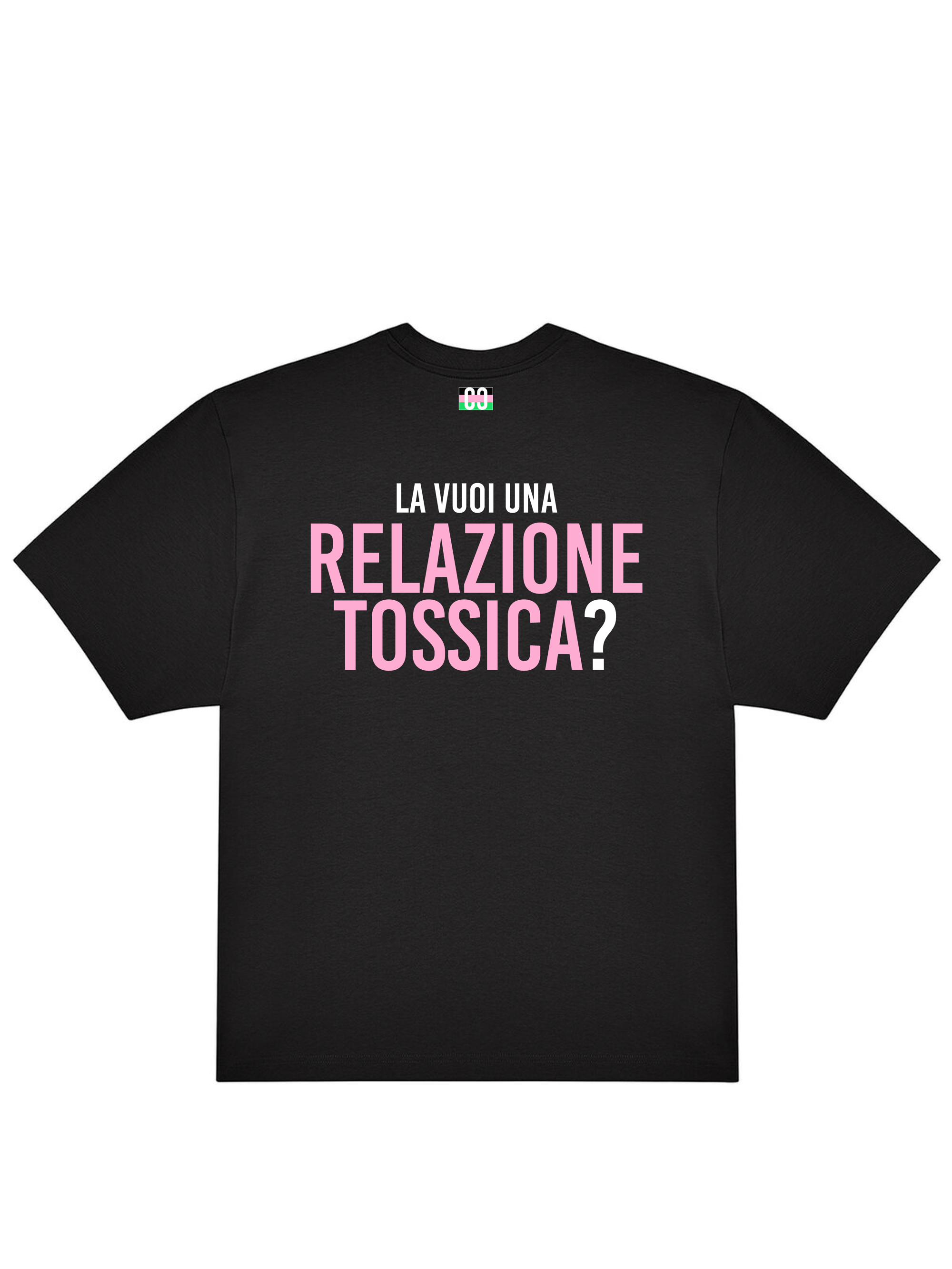 T-shirt 180gr oversize (top quality) con tag CaptainCardoni sul fronte, Bandiera dei Single e La vuoi una Relazione Tossica? sul retro